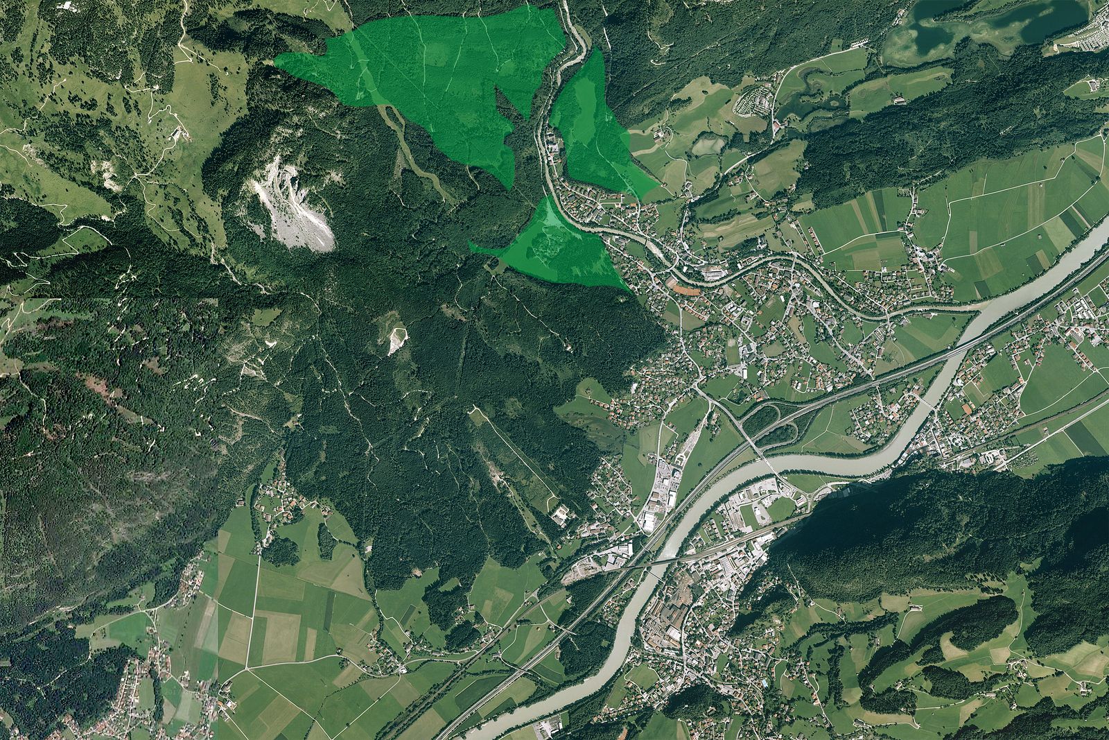 Im Talbereich hat sich die Brandenberger Ache bereits wieder tief in das Bergsturzmaterial eingeschnitten und nur ein paar große Lias-Kalkblöcke, die bei der Tiefenerosion der Ache nachrutschen, beweisen die einstige vollkommene Verschüttung der Talmündung.« (S. 10)